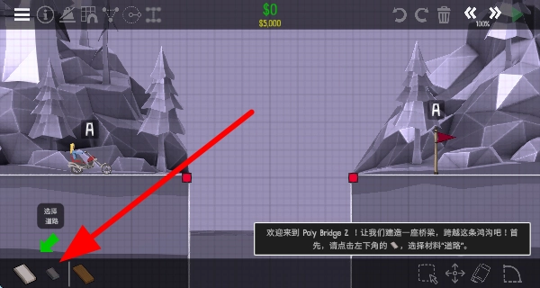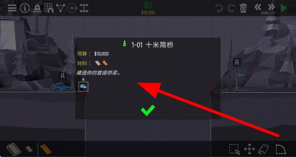 1、进入关卡,查看预算和材料,明确要建造的桥梁类型,为后续桥梁设计建造做准备,开启造桥挑战。