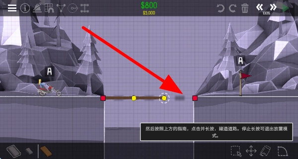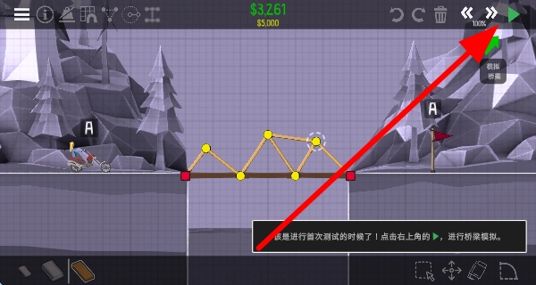 3、按照提示,点击并拖动物体来建造桥梁,通过调整结构等方式,打造出能让车辆通行的桥梁雏形。