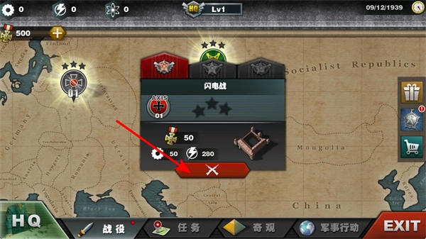 1、选择战役,在战役界面选择闪电战等战役,查看战役所需资源和奖励,进入战役地图。