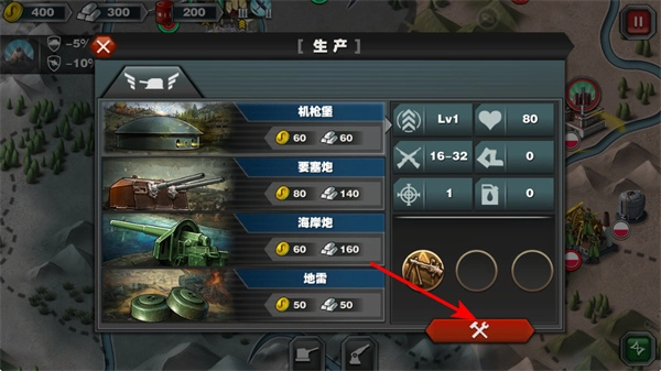 4、建造军事建筑时,可在生产界面挑选机枪堡、要塞炮这类军事建筑来开展建造作业,以此提升阵地的防御水平。
