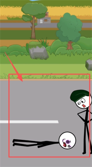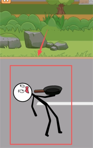 2、选择红色方框内那个肩扛煎锅、面露惊讶神情的火柴人,再按照箭头的指示,点击左侧的巨型岩石来探索场景。