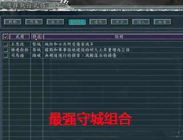 在血色模式下,城池的耐久度会翻倍增长,这使得游戏里的攻城战本身就极具挑战性。更夸张的是,游戏中存在几个对守城极为有利的技能,它们组合使用时互不冲突——只要城池里有掌握这些技能的特定人才,整座城就会变得铜墙铁壁。这组关键的技能组合便是“坚城+筑城+踏破”。 其中,“坚城”是守城的核心技能,能让所有对城池的攻击伤害直接减半;“筑城”则可大幅提升城池每回合的耐久回复量,从原本的400暴涨到800,效果堪称离谱。通常来说,只要有了这两个技能,城池基本就等同于无敌状态——哪怕占据的是关卡,只要偶尔抽空输送些兵力补充,敌军根本没有攻破的可能。至于“踏破”技能,则是用来防备敌军火攻的后手:由于“坚城”的减伤效果,火攻造成的损伤反而会高于普通攻击,有了“踏破”就能有效规避这一威胁。