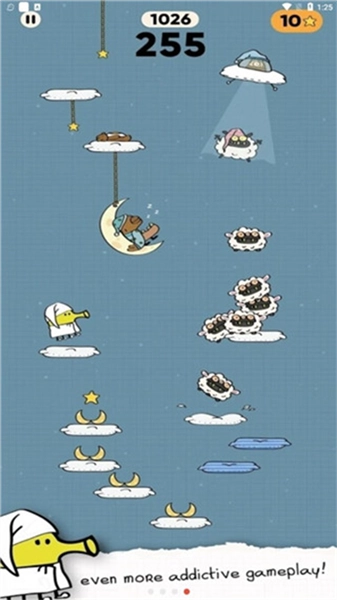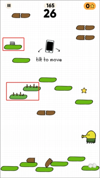 3、通过摇动手机来操控角色的跳跃动作与移动方向,同时要让角色持续在线跳跃,玩家需要把握好自身的跳跃节奏。上方的平台是固定不动的,不过其位置分布是随机的。