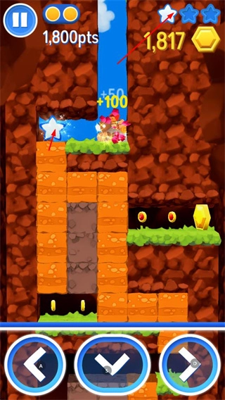 1、操控角色在地下场景中挖掘方块,收集金币、宝石等资源,同时获取分数。