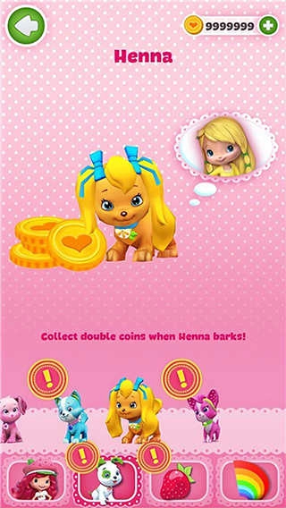 4、Wenna,黄色的小狗,解锁需要花费3950的金币,另外跟它对应的公主是黄色衣服和头发的公主,效果和之前的小狗一样也是让金币加倍。