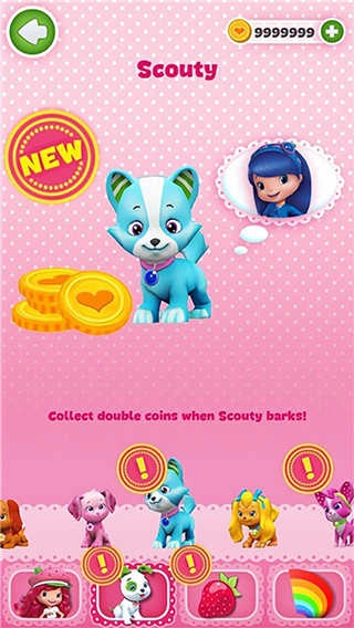 3、Scouty,这只蓝色的小狗,解锁条件是3450金币,与它对应的公主也穿着蓝色衣服、有着蓝色头发,二者一同出场时,同样可以让我们获得的金币数量翻倍。