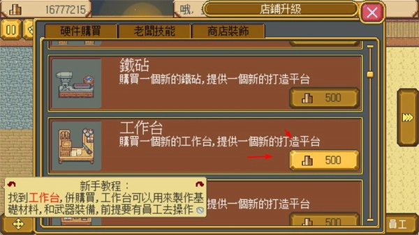 1、在店铺升级界面,购买硬件设施,为打造装备和道具提供平台,这是经营店铺的基础操作。