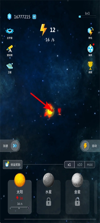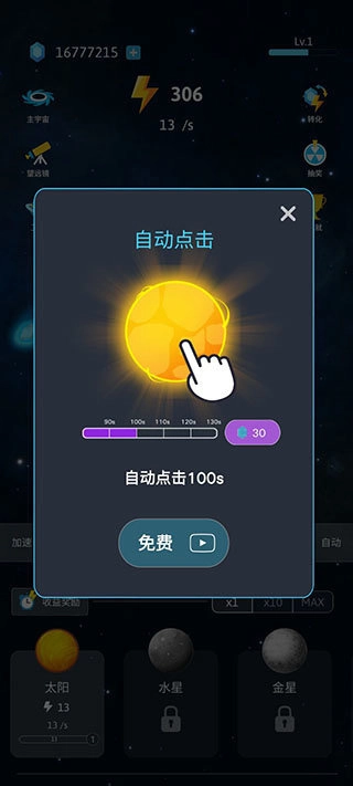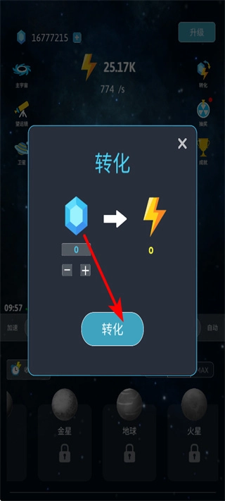 游戏内设有自动点击与能量兑换两大实用功能:消耗60颗钻石即可激活自动点击,无需手动重复操作,有效减轻游玩负担;点击界面右上方的转化按钮,就能将对应资源兑换为能量,助力解锁新星系、大幅提升游戏推进效率。