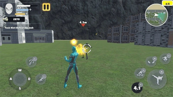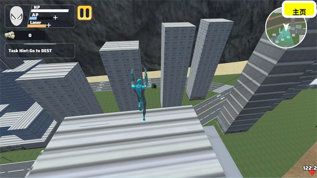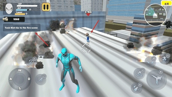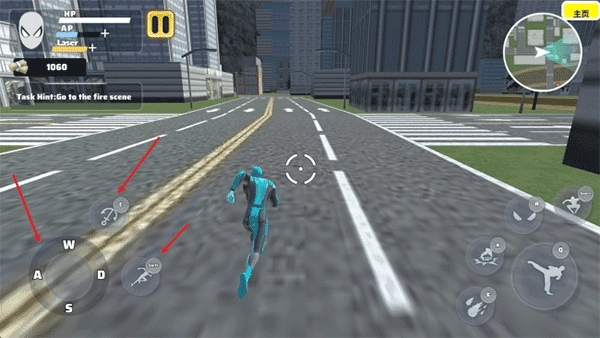 3、左侧的虚拟摇杆用来控制角色的移动方向,旁边的按钮能够发射绳索并触发加速滑行,灵活运用这些功能可以让你在城市之间快速穿梭,显著提高机动效率。