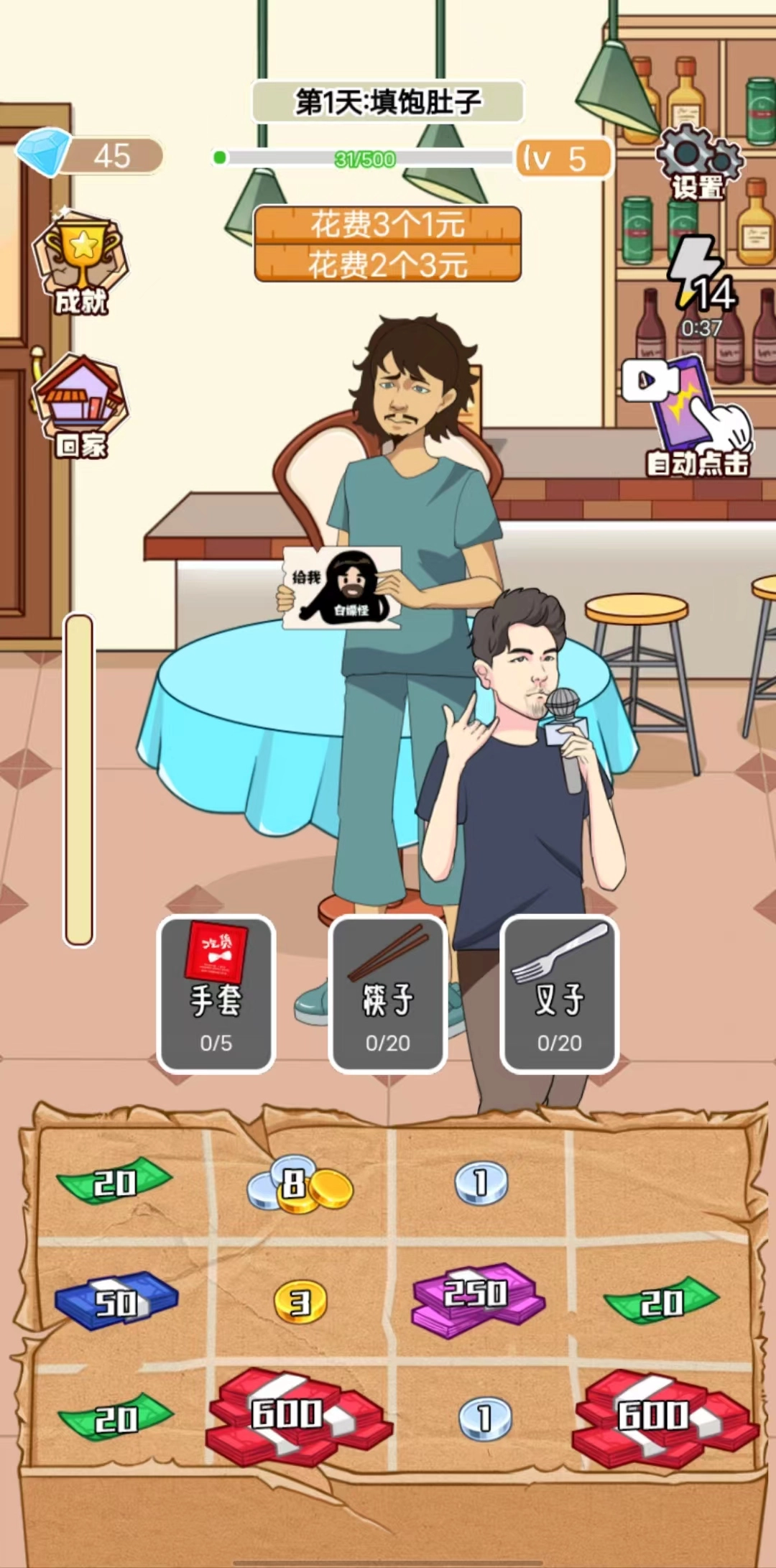 1. 玩家点击屏幕开始乞讨,获得金币和物品。