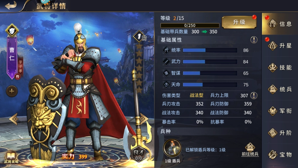1、曹仁,战法输出型盾兵武将,主属性统率,技能上偏向针对高额兵刃输出的阵容。