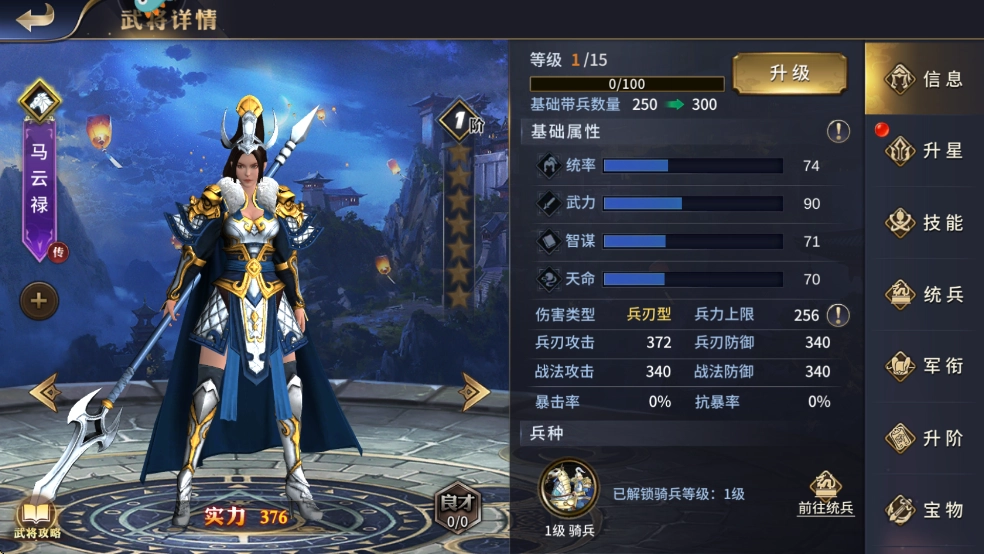 1、马云禄,兵刃输出型骑兵武将,主属性武力,技能设计上专门克制盾兵,意在充分发挥骑兵的兵种特性,击杀敌方盾兵,以取得兵力优势。
