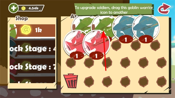 2、拖动哥布林战士图标进行升级,士兵升级是强化战力的核心步骤,拖动相同士兵图标提升士兵等级,增强能力。