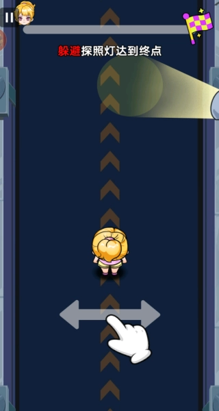 1、点击屏幕即可操控角色向前移动,执行任务时要巧妙避开探照灯的照射区域,最终顺利到达任务的终点位置。