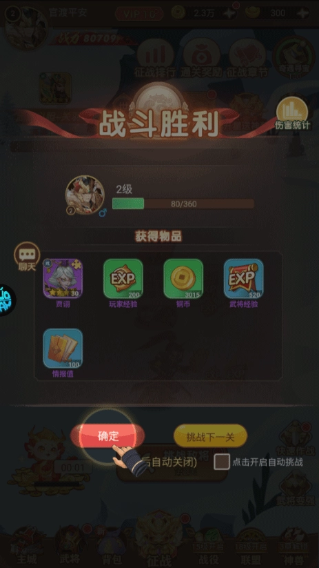 参与战斗的上阵武将能获取通关经验,在前期这个效果较为显著,即便不使用经验药水,武将的等级也不会处于过低的水平。