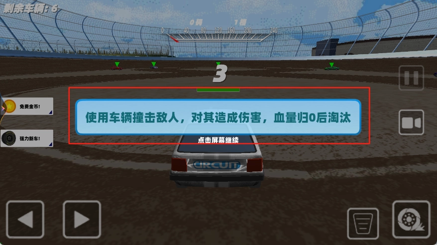 1、进入竞技场后驾驶车辆主动撞击其他参赛车辆,通过造成伤害争夺最终胜利。