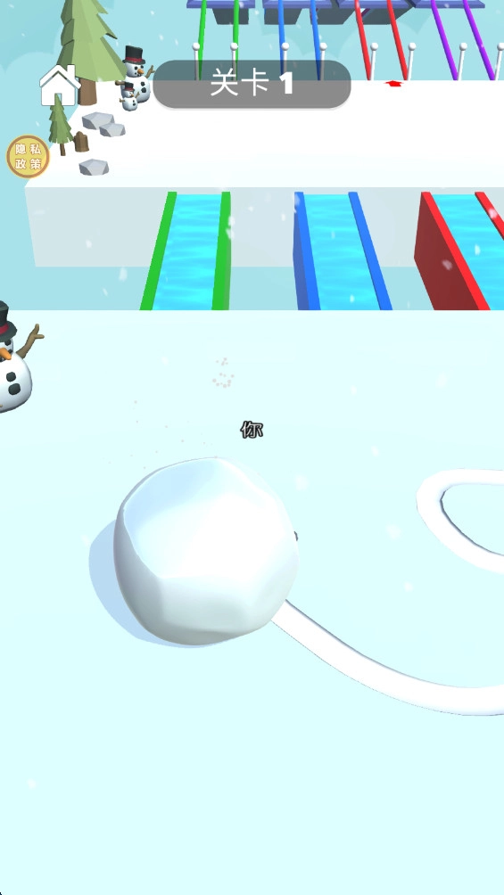 通过左右滑动屏幕来操控雪球的移动方向,收集路上散落的雪花让雪球变大,避开障碍物以免雪球变小。