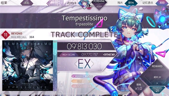 3、谱面等级处于8到9级区间时,在对按键、判定机制以及立体呈现特色有了基础认知与熟悉度后,此阶段会进一步深化对判定的把控和基础配置的掌握,同时逐步减少对目押操作的依赖。处于该阶段的玩家,至少应具备稳定达成ex6级及以下谱面的能力——能够ex某一谱面,意味着已能大致理解其设计逻辑并进行拆分处理。针对此阶段的建议是:重点将prs7难度的谱面冲击到ex评价,若觉得难度较低,可尽量向ex+评价推进;若当前确实难以驾驭,则可暂时搁置,待后续能力提升后再尝试。