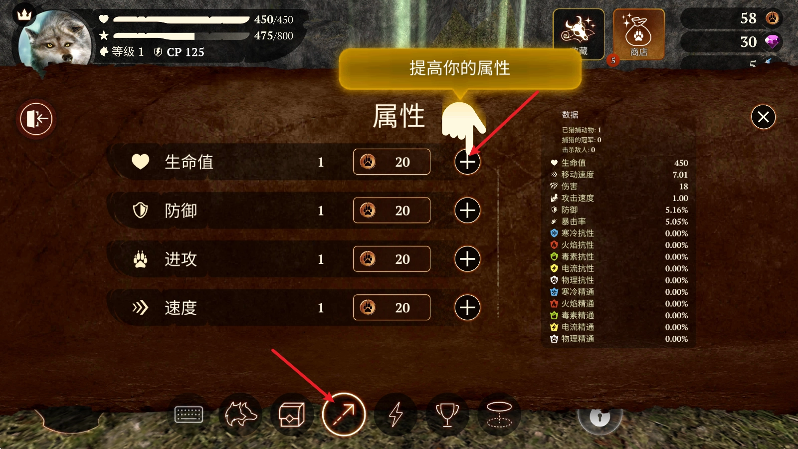 5、击败猎物后就能够获得金币了,利用金币就可以提升你的各项属性了。