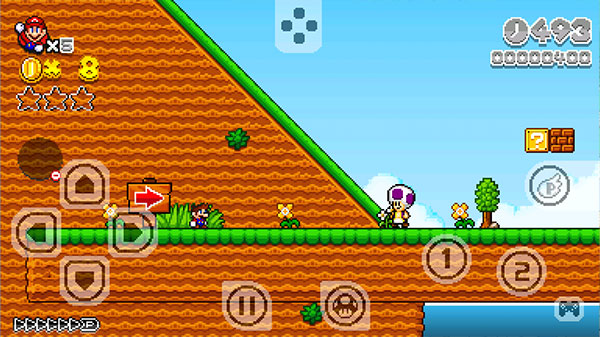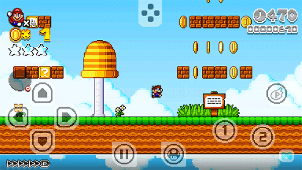 3、移动马里奥,底部有暂停按钮,可以随时暂停画面,1是拾取,2是跳跃;