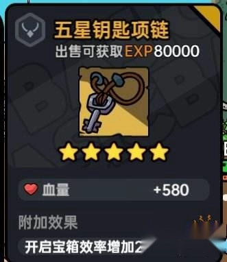 6、搭配散装项链:钥匙项链。角色达到五星后,每次攻击宝箱的效率会提升2点,且每次攻击宝箱时能使其掉落3点生命值。