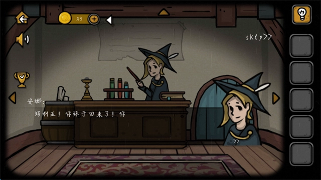 这里我们点击莉莉的床,就能睡觉度过一晚。到了第二天,安娜会说莉莉不见了,对话结束后,我们点击她的魔法书,多点击几次翻页就能获得火柴,左边的木桶上还能拿到太阳魔法卷轴。