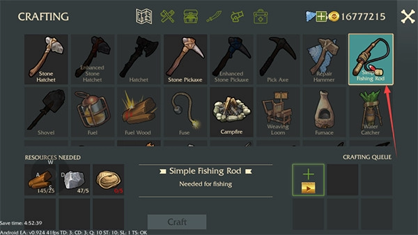 1、在工具制造页面消耗材料制作鱼竿