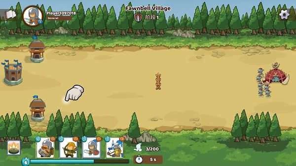 进入战斗关卡后,屏幕左下角会呈现当前可调配的兵种清单,顶部蓝色能量条象征行动资源。各类兵种耗费的能量数值存在差异,像炮兵需要4点、弓箭手3点、地雷2点、骑兵3点。一旦能量积累充足,仅需把相应兵种拖拽到战场指定区域就能完成调配,操作清晰且具有策略性。