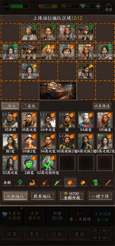 1、在末世区块化的进阶探索中,你将以超市老板的身份派遣员工前往各个区块搜集物资,过程中会有概率触发临时战斗。