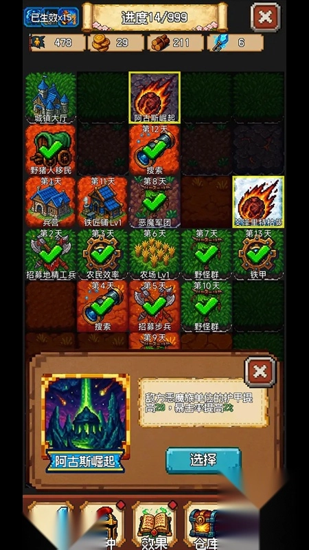 首先解锁伐木场与铁矿厂,保障资源的稳定供应;接着修建兵营和魔法塔,完成基础的军事与防御设施建设;最后选择低难度的地块发起挑战,以此积累作战经验。