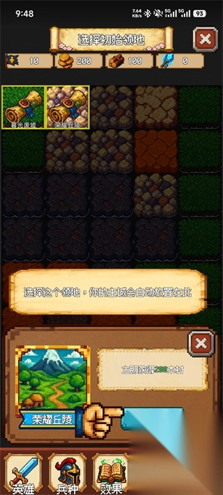选择初始领地:建议选“荣耀丘陵”,可获得200木材,为前期发展提供资源基础。