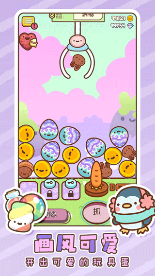 极其简单,玩家仅需操控屏幕右侧的杆子与按钮,就能完成移动与抓取动作,把彩蛋抓起来。成功抓到彩蛋后,就要着手从彩蛋中孵出娃娃,每个彩蛋孵出的娃娃都独具特色。而且在娃娃孵化过程中,或许还需消耗相应金币来加速孵化,如此便能更早看到彩蛋里的娃娃。另外,在萌宠娃娃机游戏里,玩家可以把从彩蛋中获得的玩具或娃娃收集到自己的藏品柜中观赏,趣味十足。感兴趣的朋友千万别错过,赶紧下载体验一番吧!游戏特色