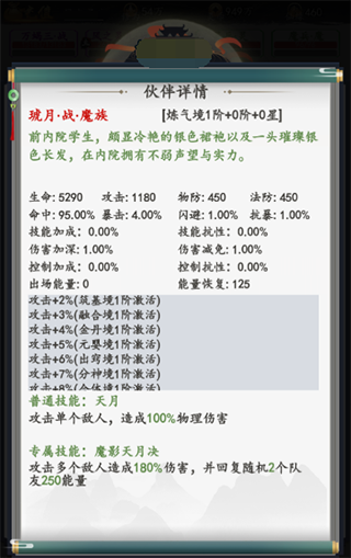 阵容方面,前排可以考虑使用琥月和秦青元。前者的技能能够提供有效的恢复能力,在前排承受损伤的过程当中,进攻敌人的同时还可以为队友们恢复大量的能量,与秦青元可以有效的抵挡住逆天魔人的攻击。而秦青元在防守方面也十分到位,建议战斗之前搭配上一个增加气血值的攻防来进行使用。