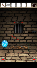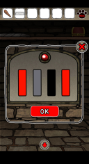 6、点击恶魔天平后石板输入红、灰、黑、红,开启石板获得黄色宝石,提示为铁栏杆房间栏杆上方宝石颜色