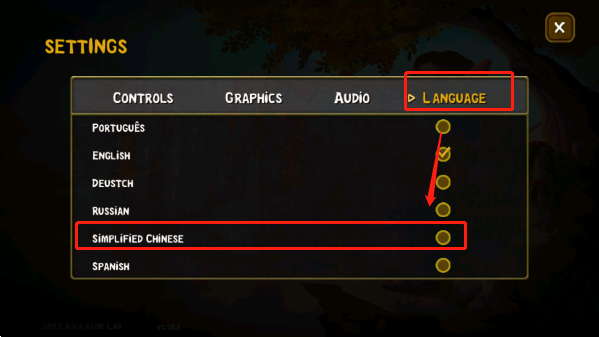 1、首次进入游戏时,默认显示语言为英文,需手动点击下图所示位置进行切换。