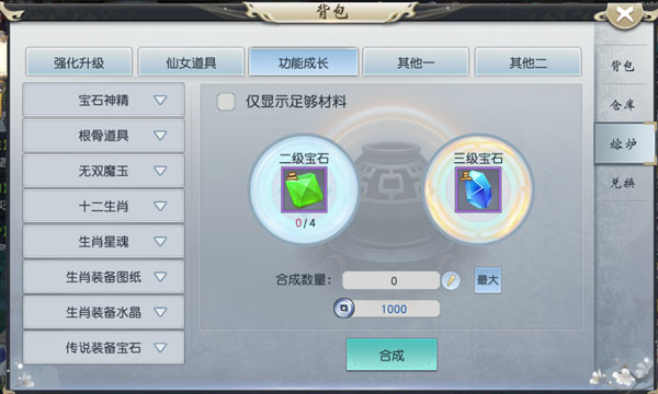 3、炼炉系统中有五个分类,分别为强化升级、仙女道具、功能成长和其他。其中,强化升级包括强化石、符类、装备升级和品质神铸;仙女道具包括仙女觉醒、仙女召唤卡和仙女品质;功能成长包括宝石神精和根骨道具等等;其他则是玫瑰花、时装等。各种材料的合成一应俱全,有如。