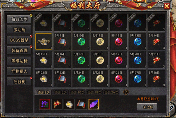 2、每月签到满2、5、10、18、26次即可领取对应奖励