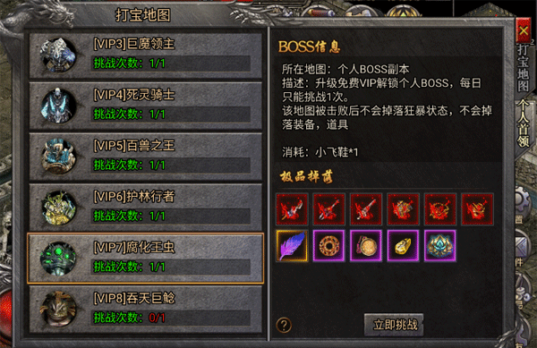 5、个人首领每天可挑战一次,掉落高级装备、高级材料