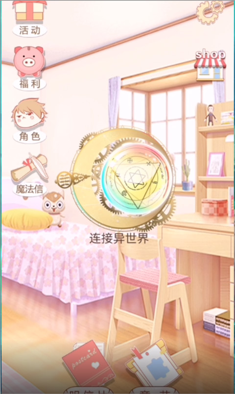 2、进入游戏主页,玩家可以查看角色、明信片,点击连接异世界即可;
