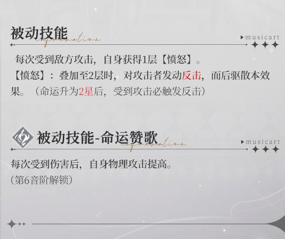 每次受到敌方攻击,自身获得1层[愤怒)[愤怒]:叠加至2层时,对攻击者发动反击,而后驱散本效(命运升为2星后,受到攻击必触发反击)果。