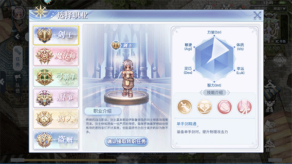 初学者只需达标后,即可转职剑士。剑士以粗犷的造型,防御和持久战斗的能力深受新玩家喜爱。他们在可以造成较高的伤害,同时还能抵挡敌方攻击,并带有自我恢复的能力。而面对负面状态和特殊怪物,剑士具备较高耐受能力。