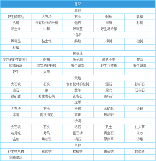在游戏中自然环境是左右玩家生存的一个重要的关键点,一小时人生的游戏自然环境分布主要有七大部分,分别是草地,沼泽,黄草原,荒地,冻原,沙漠,丛林,那我们都来看看在这些地方都有什么可以提供合成,提供生存的资源吧!