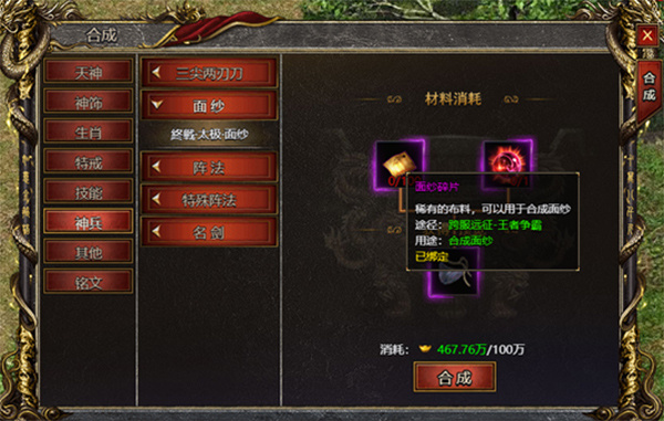 2、大家收集足够的面纱碎片后,可进入到合成系统里的神兵界面,消耗这些材料来合成初级面纱,或者提升身上佩戴的面纱等级,来获得更多的属性效果。