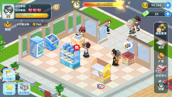 与全世界的玩家比赛看看谁的超市好评最高,谁的超市每日营业额最多。合理设置热卖的商品,搭配双11大促销活动,指点之间提高超市业绩。
