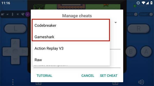 3、根据代码格式选择Codebreaker或Gameshark模式输入作弊码。