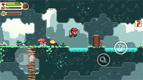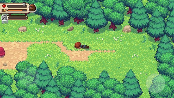 在我们没有武器的时候路上的灌木丛会挡住我们的去路,有武器的时候只需要点击攻击就可以击毁灌木丛,在击毁灌木丛后有几率掉落补血的红心和金币。在屏幕的左上角绿色条是我们的生命值,底下的黄色条是经验值,击杀怪物后可以获得大量经验升级。在森林中如果遇到宝箱的话一定要面对宝箱点击攻击键可以打开宝箱获得物品。在游戏中看到蓝色的光圈时一定要在上面站一下因为这是保存记录的,每当玩家战败后都可以再上一个地方复活。