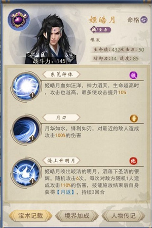 姬皓月为法坦,全体攻击,较为中庸,输出和肉度都是不上不下,目前主玩姬皓月的都很痛苦,所以不建议玩,不多诉说。