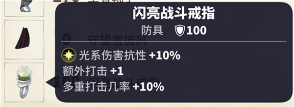 选择掉落的闪亮斗战戒指,属性:额外打击+1,多重打击几率+10%。