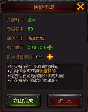当你过达到80级以后,就能进入到经验圣域之中。经验圣域也是一个练级的好地方,击败经验圣域中怪物之后将会获得海量的经验值,在经验圣域中练级的时候可以看到轻松看到经验条上涨的痕迹。经验圣域一天中能够修炼5分钟,当然,追求速度的玩家可以花费钻石购买修炼的时间,每次可购买5分钟。