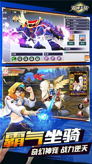 神兽作伴,闪电黑豹供你骑乘,赤焰火龙伴你作战,更有幻影摩托任你驰骋超神大陆!更有神翼加身,玄铁流光360度特效展示。华丽酷炫的坐骑和翅膀系统,战力飙升99999+!光武神装,王者标配!